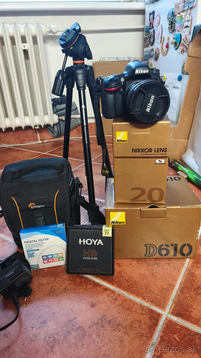 Nikon D610 FX + objektív Nikkor 20mm f1.8 G ED + filtre CPL Hoya Hd ND filter + brašňa + statív + diaľková spúšt Nikon komplet krabice . Stav uzávierky pod 6000. Stav nového kusu . Dohoda možná . Ideálne vyskúšaţ osobné.