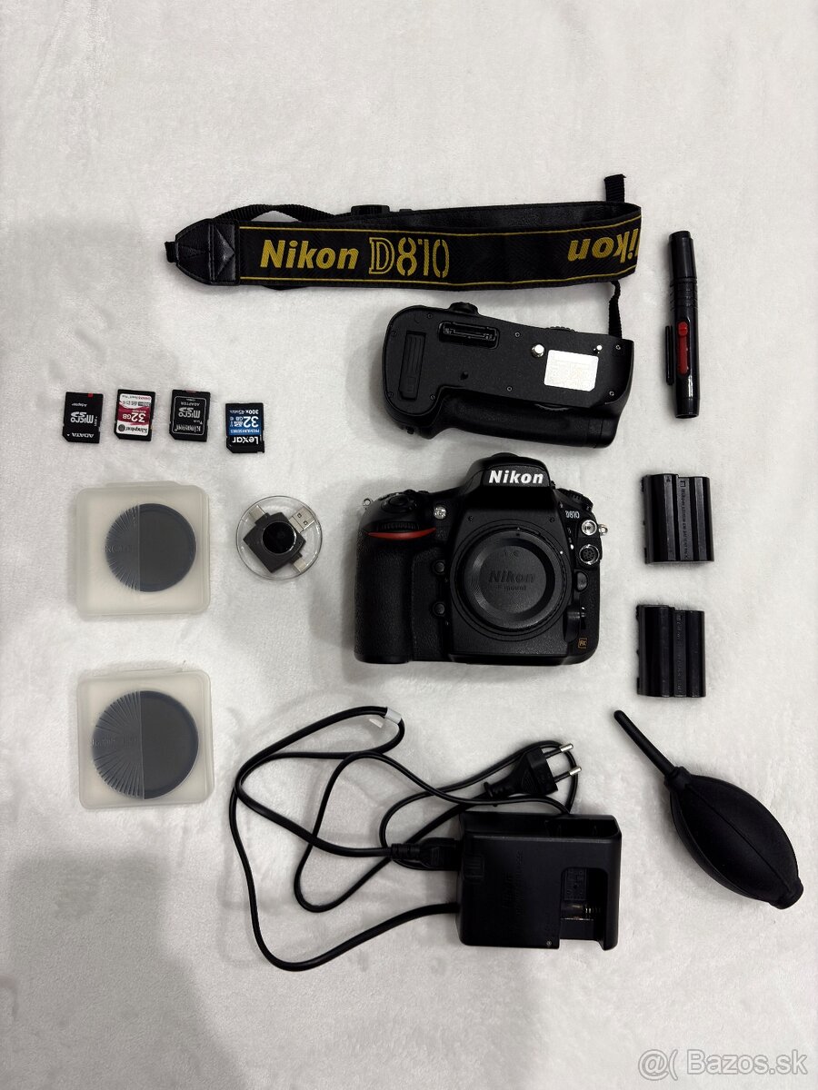 Predám telo Nikom D810 v skvelom stave všetko funkčné a naozaj minimálnd známky používania, má nafotených cca 80000 snímok. K fotoaparátu ponúkam všetko čo je na fotografii takže: Telo, Originálny battery grip, popruh, 2x originál batéria, originál nabíjačka, 2x ND Filter (62mm a 52mm), unuverzálna čítačka kariet, 4x SD Karta, sada na čistenie. Kontaktujte ma prosím telefonicky alebo SMS správou.