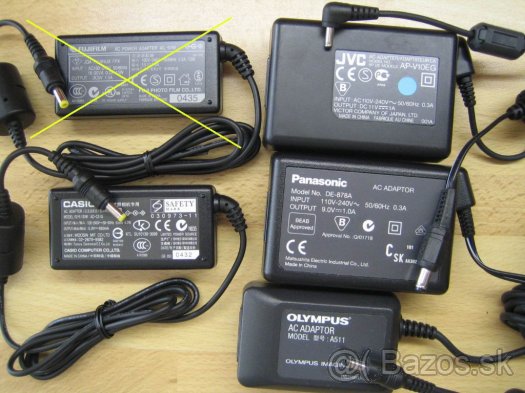 Predám tieto nepoužívané sieťové adaptéry pre kamery/foto: Fuji AC-5VW, Casio AD-C51G,JVC AP-V10EG, Panasonic DE-878A, Olympus A511.