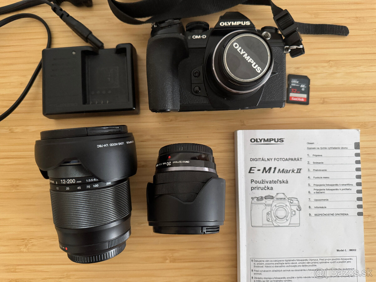 Predám používanú bezzrkadlovku Olympus E-M1 II s príslušenstvom (pútko, návod, 32 GB SD karta, nabíjačka), portrétny objektív m.Zuiko 45mm f1.8 (ohnisko 90mm na kinofilme), street objektív odolný voči prachu a vlhkosti m.Zuiko 20mm f1.4 (ohnisko 40mm na kinofilme) a superzoom objektív takisto utesnený voči prachu a vode m.Zuiko 12-200mm f3.5-f6.3 (ohnisko 24-400mm):