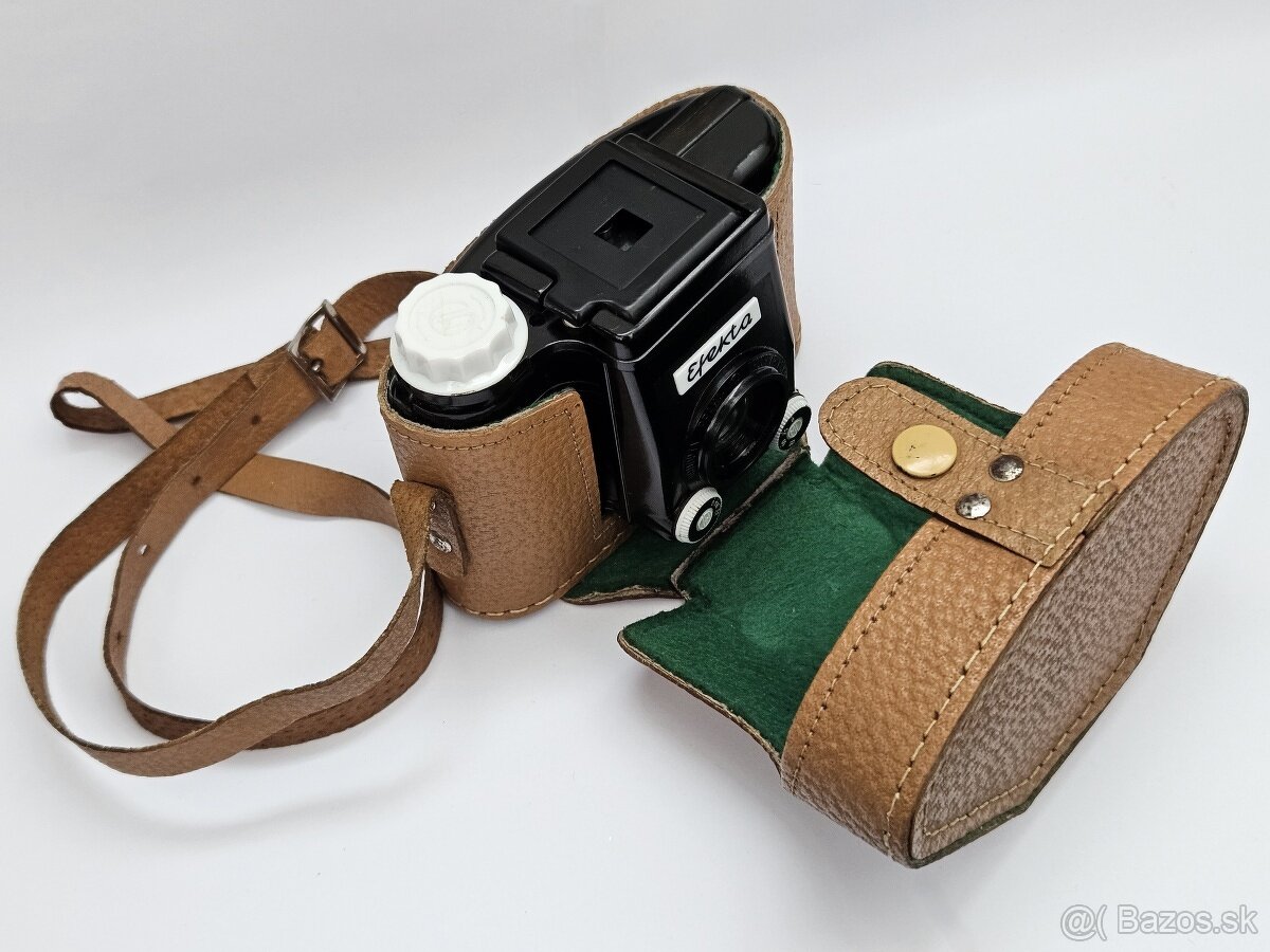 Predám československý analógový fotoaparát Druopta Praha Efekta na zvitkový film 120 na cievke B2 – 6 x 6cm s objektívom Druoptar 1:8, f=70mm (1/25, 1/50, 1/100) spolu s pôvodným koženým puzdrom. Telo fotoaparátu je z čierneho bakelitu. Fotoaparát pochádza z 50. rokov. Uzávierka/clona objektívu sa občas zasekáva a navíjací mechanizmus cievky nie je funkčný (vyskočená pružinka je súčasťou). Je vhodný pre zberateľa, prípadne po servise aj na používanie.