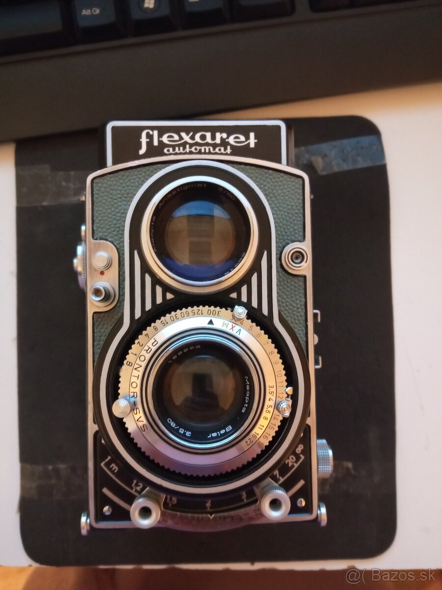 Predám Flexaret automat v dobrom technickom stave. Telo fotoaparátu a ani objektív nie sú poškodené. Všetky expozičné časy fungujú, ale keďže bol fotoaparát desiatky rokov nepoužívaný, je potrebné ho vyčistiť od starého maziva a dať nové. Je k nemu aj puzdro.