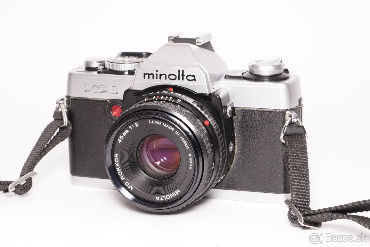 Predám zrkadlovku Minolta s objektívom MD 45mm 1:2, filtrom, manuálom a slnečnou clonou.